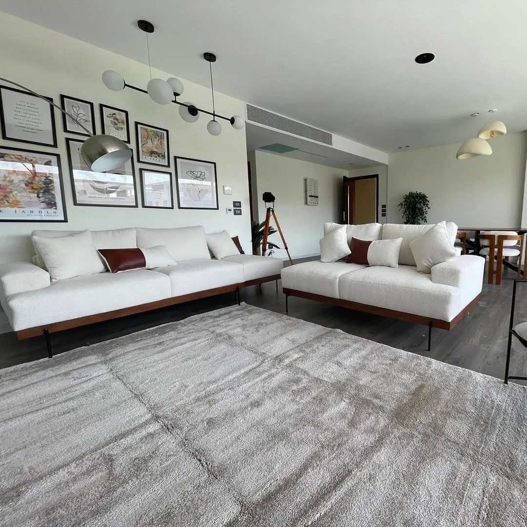 • Crafted from high-quality, modern fabric that is soft to the touch and highly durable, the Laura U Sofa offers exceptional comfort. Its unique design includes a peach-colored wooden frame, a sturdy metal base, and sponge-filled cushions and backrests with medium firmness for optimal support.