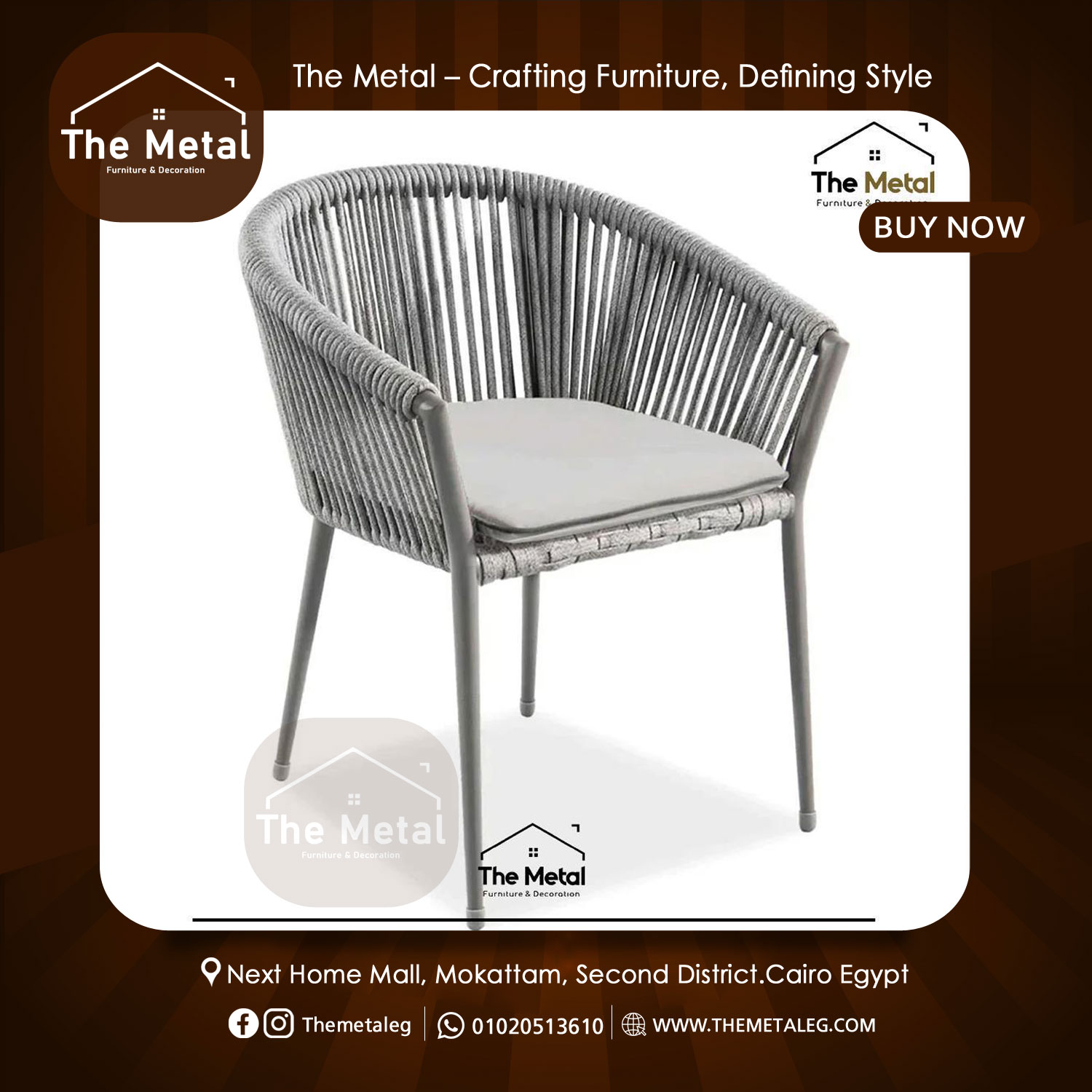 - The rustic rope metal chair from The Metal brings together natural warmth and industrial strength in a distinctive modern rustic design. This rustic rope metal chair features a durable, rust-resistant metal frame wrapped with handcrafted natural rope made from jute or cotton, creating rich texture and visual balance. The combination of solid metal and organic materials makes it suitable for both indoor and outdoor environments, from dining rooms and terraces to cafés and modern restaurants. With well-balanced dimensions of 70 × 50 × 50 cm, the chair offers comfortable seating while maintaining a clean, stylish profile. An optional padded cushion is available for enhanced comfort during extended use. Designed for durability, versatility, and timeless appeal, this chair is an ideal choice for spaces that value craftsmanship and character. Priced at EGP 3,723, it is a statement seating piece that elevates any setting.
